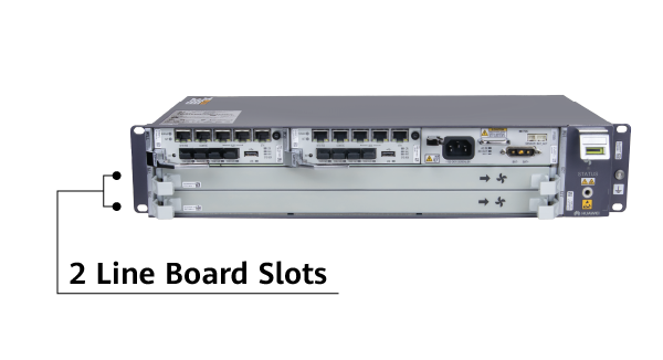 The MA5800-X2 chassis is designed for installation in a 19" rack and has a height of 2U. It supports the installation of up to 2 PON or P2P line boards, depending on the needs of a given location. In a full configuration, the OLT can provide up to 32 PON ports (GPON / XG-PON / XGS-PON), 96 GE ports, or 16 10GE ports.