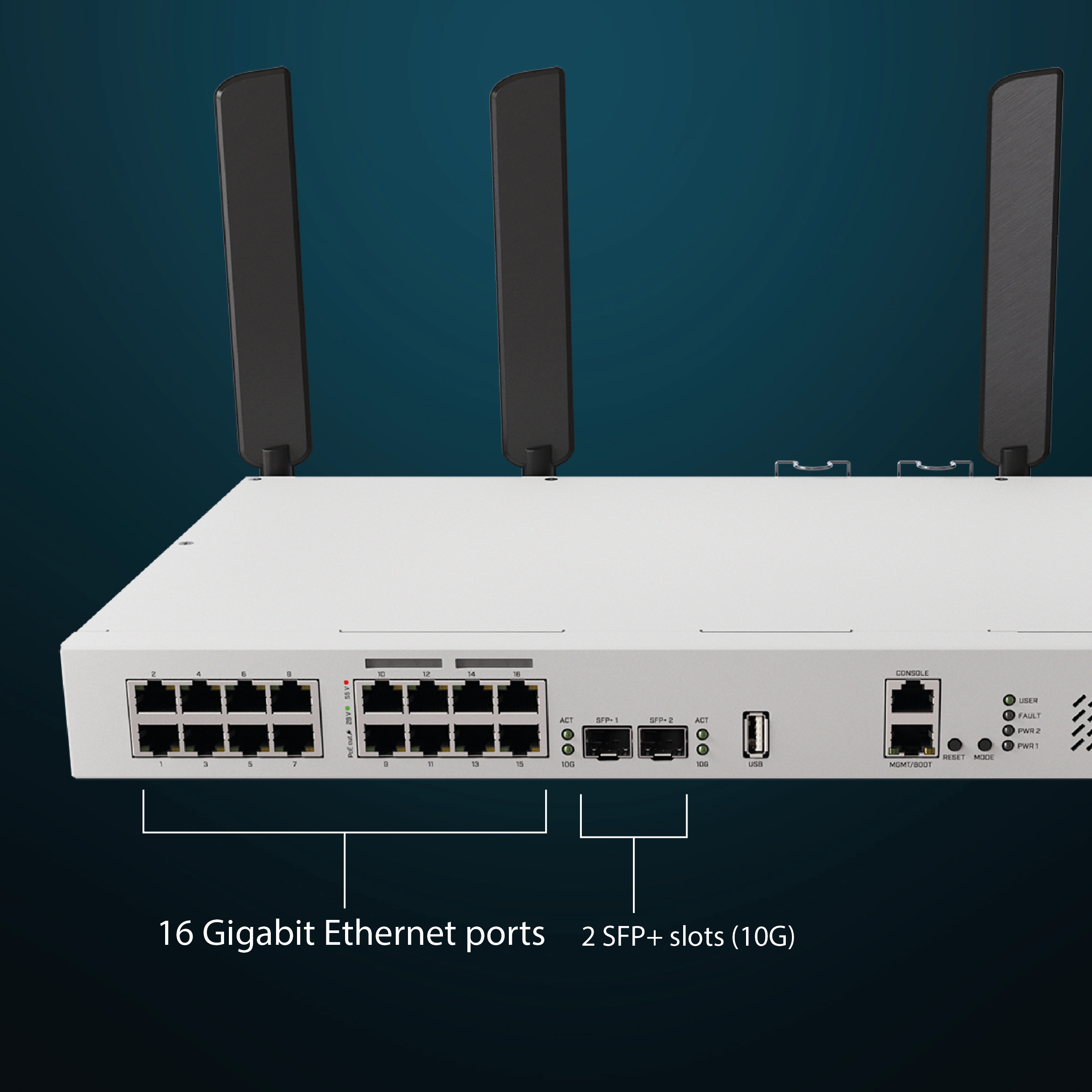 The CRS is equipped with 16 Gigabit Ethernet ports (10/100/1000 Mb/s) and 2 SFP+ slots (10 Gb/s). Such a large number of Ethernet interfaces allows you to eliminate the need for an additional switch in many scenarios. The high-capacity SFP+ slots work perfectly as WAN ports, especially if you are using a data package exceeding 1 Gb/s. The second slot can be used to connect a high-speed device such as a NAS server.