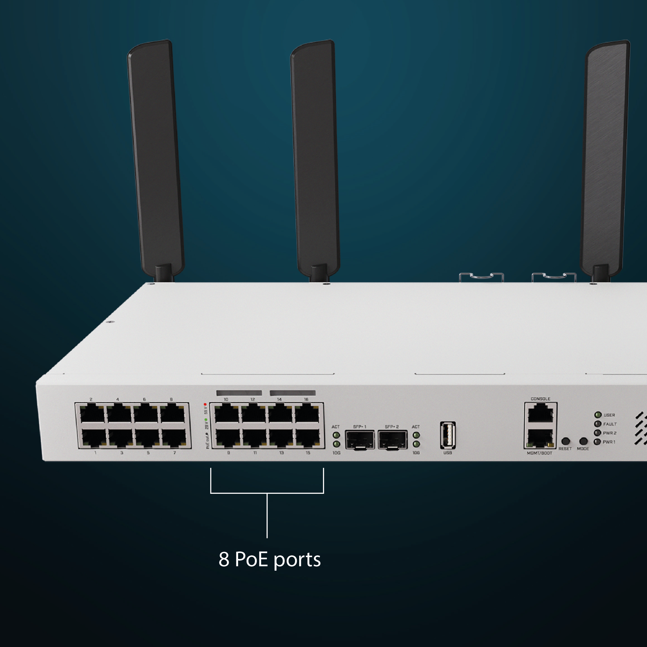 Ethernet ports 9–16 additionally feature PoE capabilities, allowing you to use either passive PoE 24 V or PoE+ (802.3af/at). The maximum total power output budget is 150 W. This is sufficient to connect 8 IP cameras or even 8 access points, as long as their power consumption is not too high. As a result, the CRS can often eliminate the need for a separate access switch in many networks.