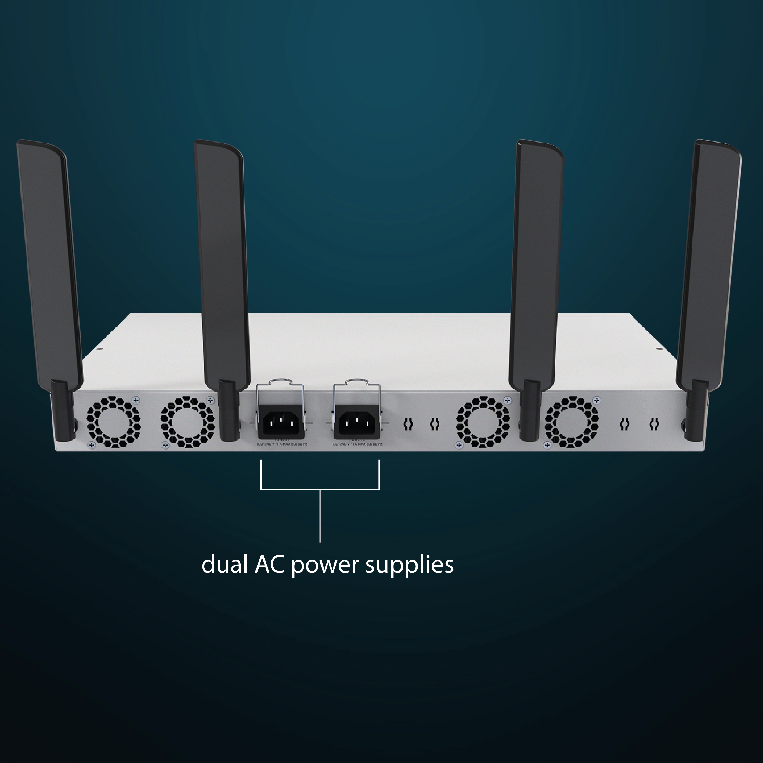 The offered product features 16 Gigabit Ethernet ports (10/100/1000 Mb/s) and 2 SFP+ slots (10 Gb/s). Additionally, 8 Ethernet ports (Ether9 - Ether16) provide PoE output (optional – passive PoE 24 V DC or PoE+ 802.3af/at). The device has two built-in AC power supplies, providing extra protection against potential failure. The chassis is designed for use in a 19" rack. If you want to use the device in an enclosed rack, you can connect pigtails and route omnidirectional antennas outside to avoid interference. All these features make the CRS418 an excellent choice for small offices and home applications, where it helps reduce the number of devices in use while maintaining advanced management capabilities.