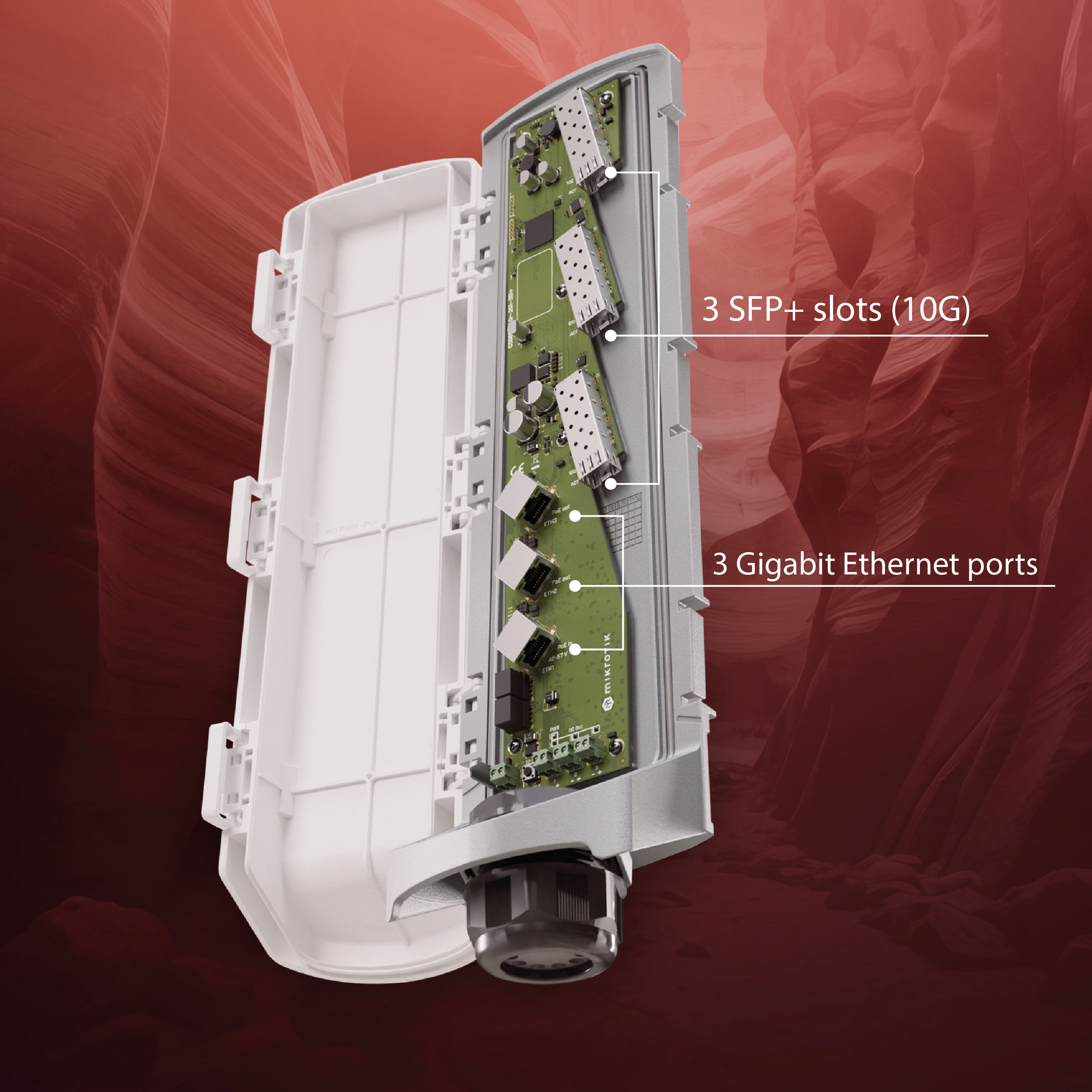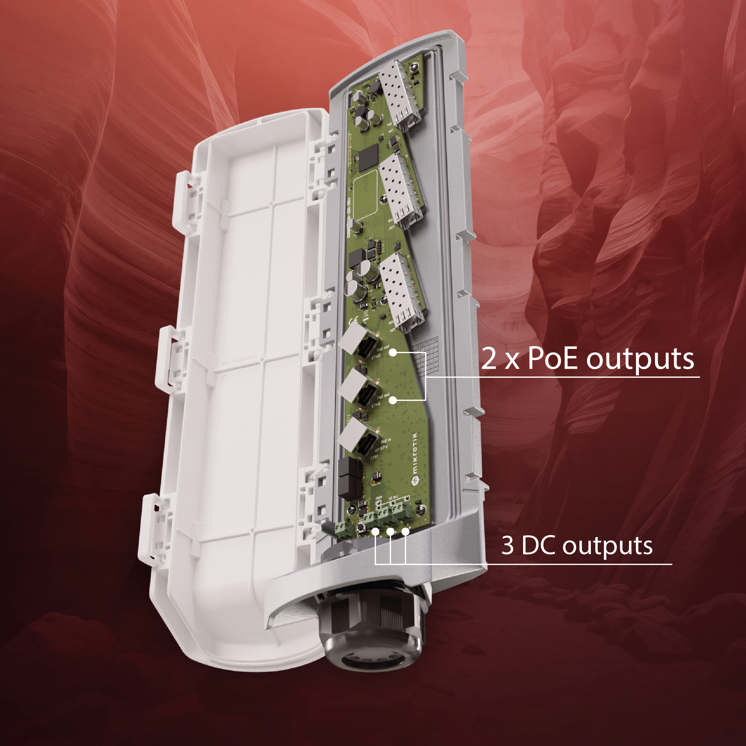 MikroTik GPERx6 is a switch designed for outdoor installation, featuring an IP66 protection rating. Its flexible design makes it a versatile solution for pole mounting. It is equipped with 3 Gigabit Ethernet ports (10/100/1000 Mb/s) and 3 SFP+ slots (10 Gb/s), providing high-capacity fiber connectivity, potentially over long distances. The GPERx6 can be powered via PoE++ (802.3bt) or a DC socket, with the latter supporting a wide input voltage range of 12–57 V DC. The switch provides 2 PoE+ outputs (802.3af/at) and 3 DC power outputs, allowing the connection of both PoE-enabled and non-PoE devices. Thanks to these features, the GPERx6 is suitable for a wide range of installations, including connecting base stations, IP cameras, sensors, or various IoT devices. Additionally, the multiple SFP+ slots allow fiber connections to other poles located at greater distances.