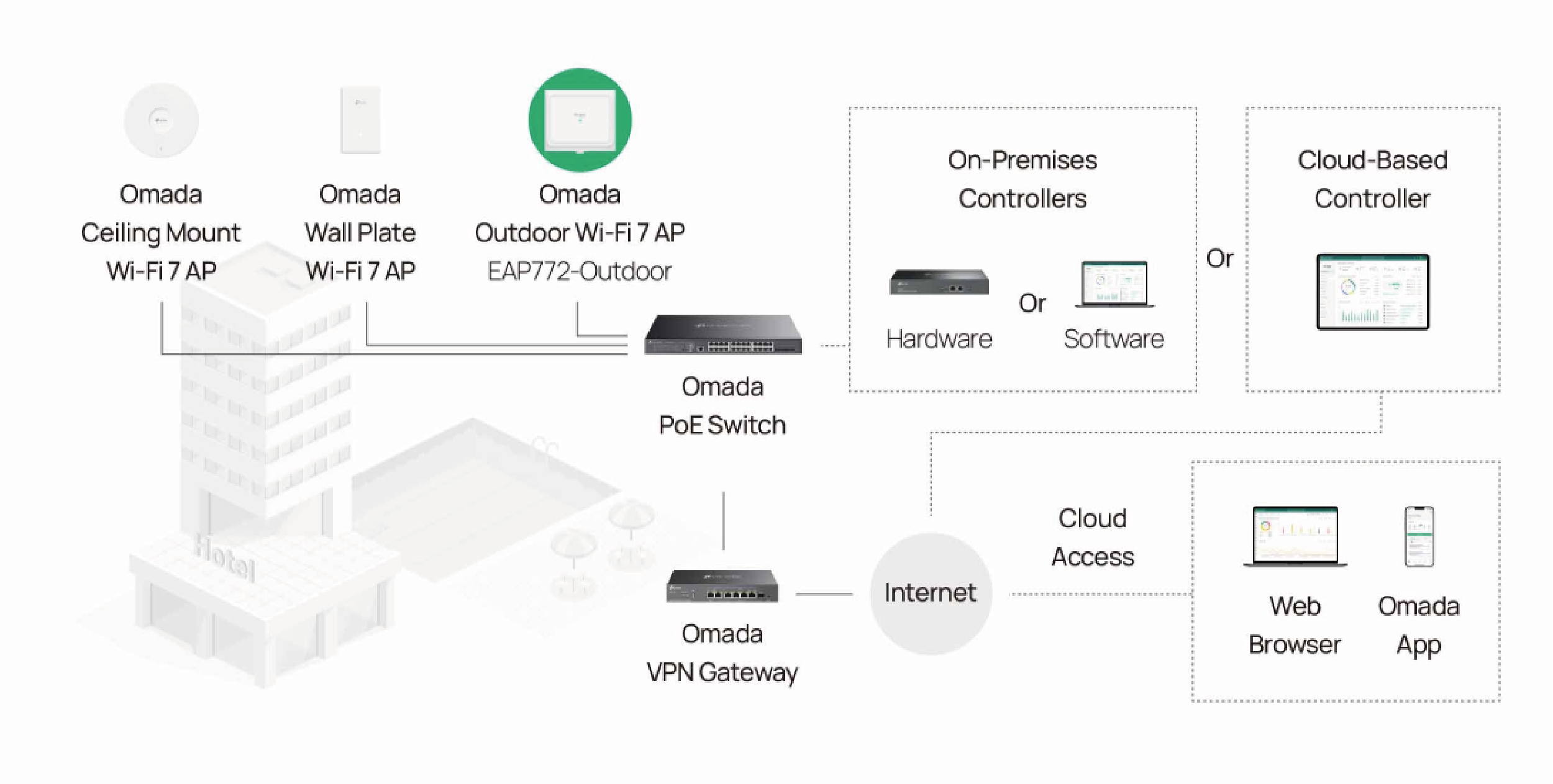 The Omada Software-Defined Networking (SDN) solution seamlessly integrates access points, managed switches, and gateways, enabling 100% centralized cloud management and highly scalable networks.