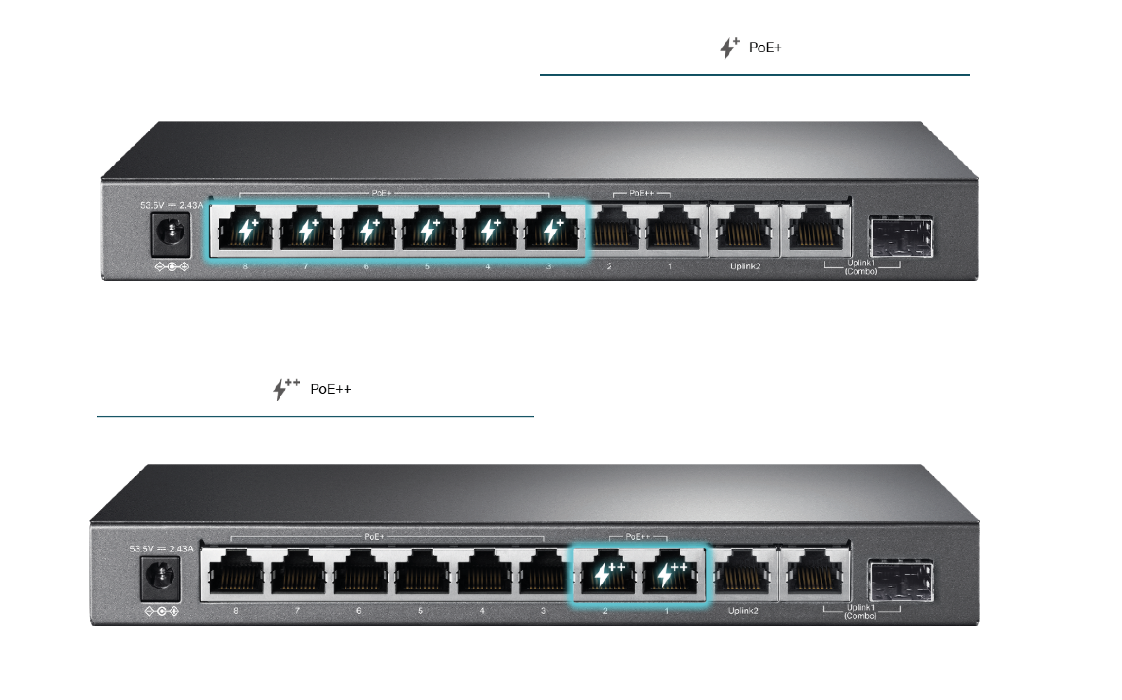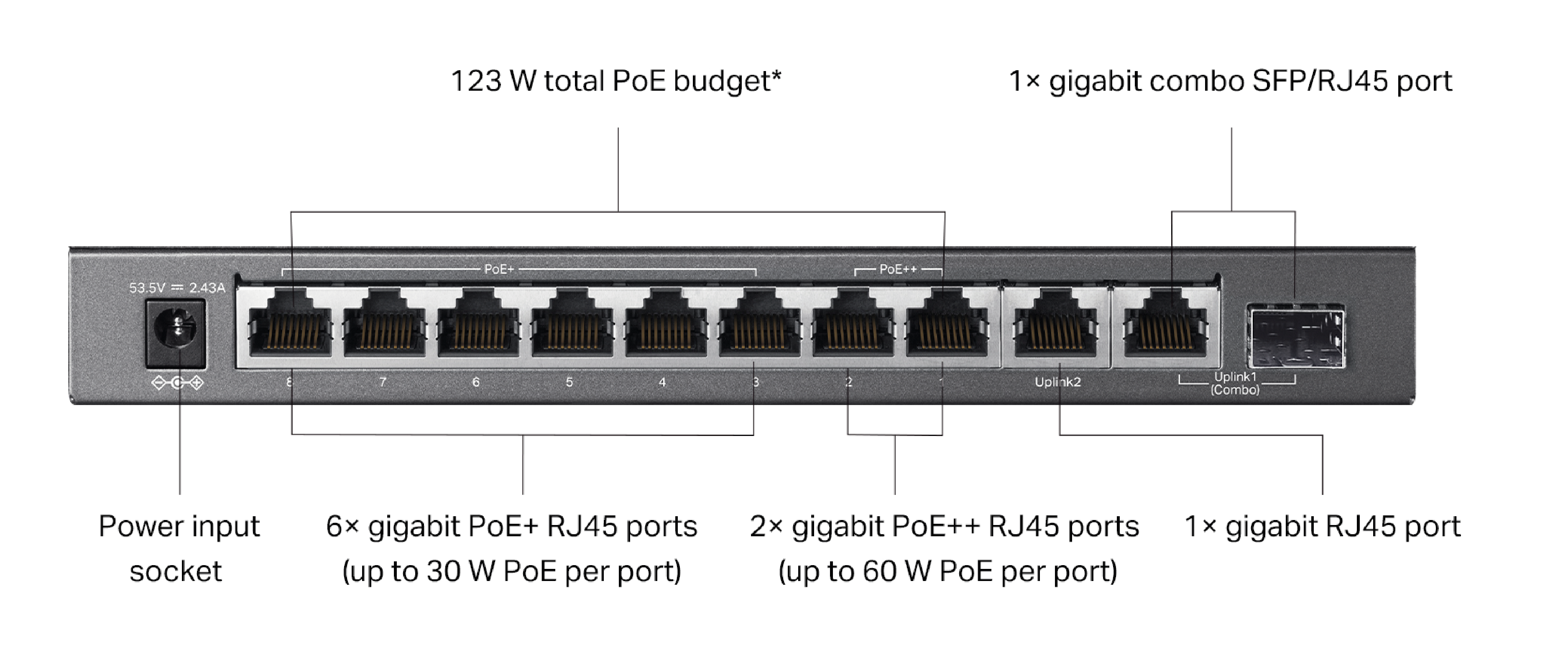 PoE Ports (RJ45) | PoE++ Ports: 1 - 2 (802.3af/at/bt compliant) PoE+ Ports: 3 - 8 (802.3af/at compliant) PoE Power Budget: 123 W |