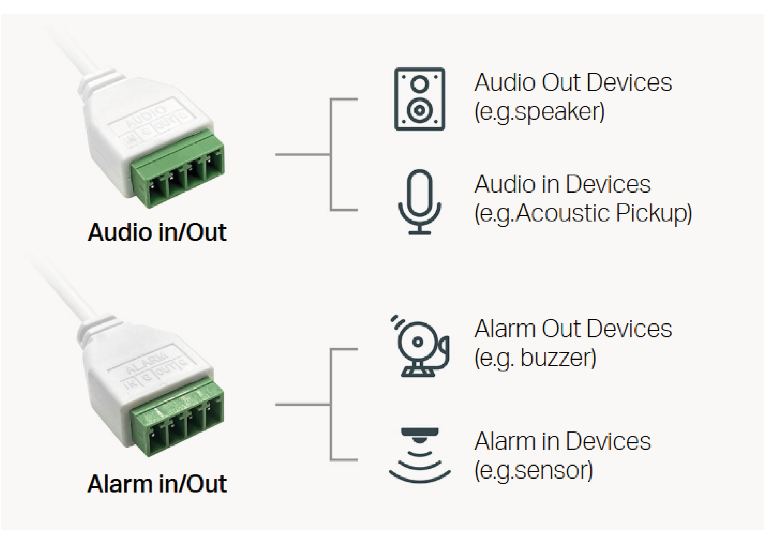 Audio and alarm input/output ports allow for easy integration with external alarms.