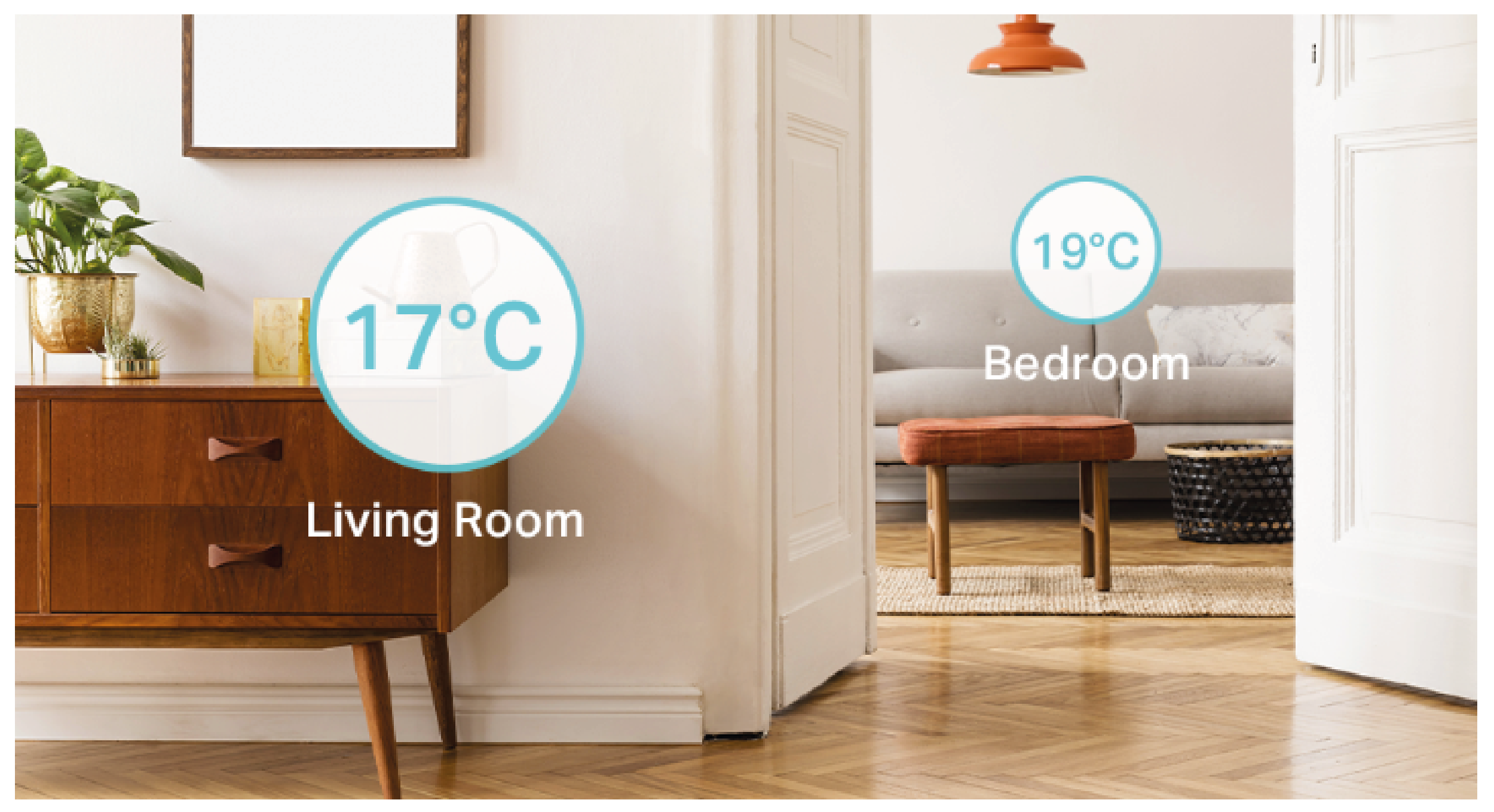 Support for external temperature sensors such as Tapo T310 and Tapo T315 allows for precise temperature control in any part of the room, by automatically adjusting the thermostatic valve based on readings from these sensors - not just near the radiator.