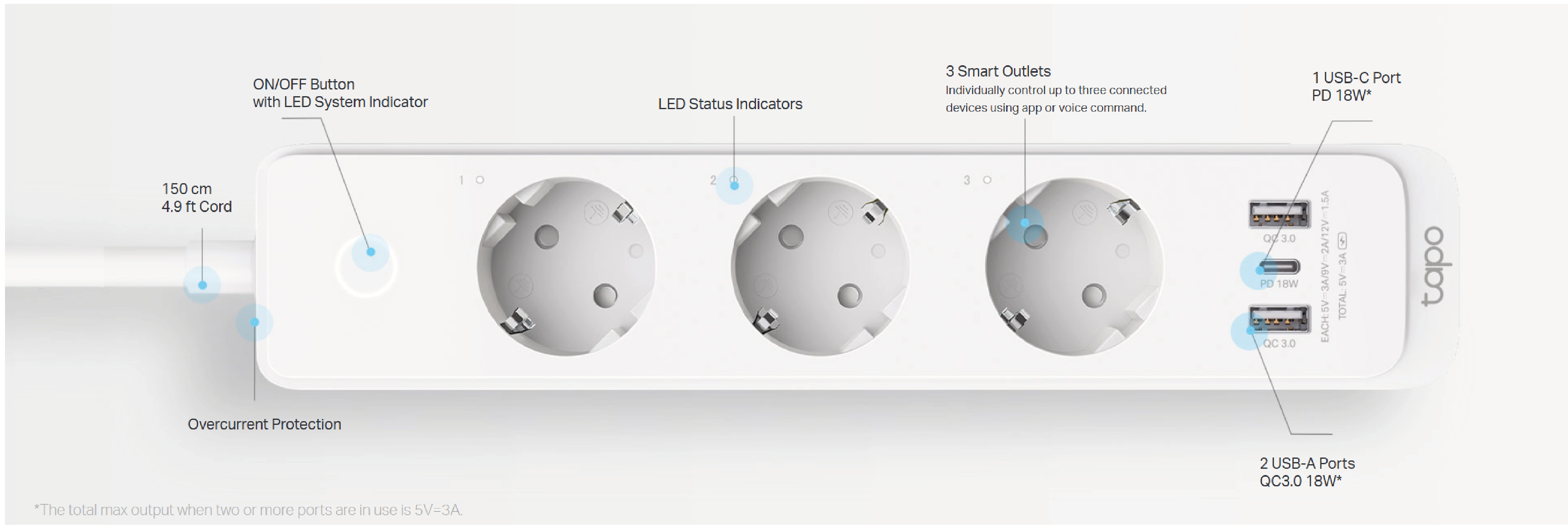 TP-Link Tapo P300 to listwa zasilająca wyposażona w trzy indywidualnie sterowane gniazda sieciowe typu E (UE), komunikująca się w standardzie Wi-Fi 4 (IEEE 802.11b/g/n) w paśmie 2,4 GHz. Posiada dodatkowo trzy stałe porty USB do ładowania urządzeń: jeden port USB-C (z Power Delivery 18 W) oraz dwa porty USB-A (z Quick Charge 3.0 18 W), przy czym porty USB nie podlegają zdalnej kontroli. Maksymalna obciążalność prądowa listwy to 10 A przy maksymalnej mocy obciążenia 2300 W (lub do 3000 W w zależności od wersji/regionu). Zasilana jest prądem zmiennym AC 220-240 V, 50/60 Hz. Urządzenie nie wymaga dodatkowego huba i jest zarządzane poprzez aplikację mobilną Tapo. Zapewnia ochronę przeciwprzepięciową, przeciążeniową oraz przed przegrzaniem. Długość kabla zasilającego wynosi 1,5 metra.