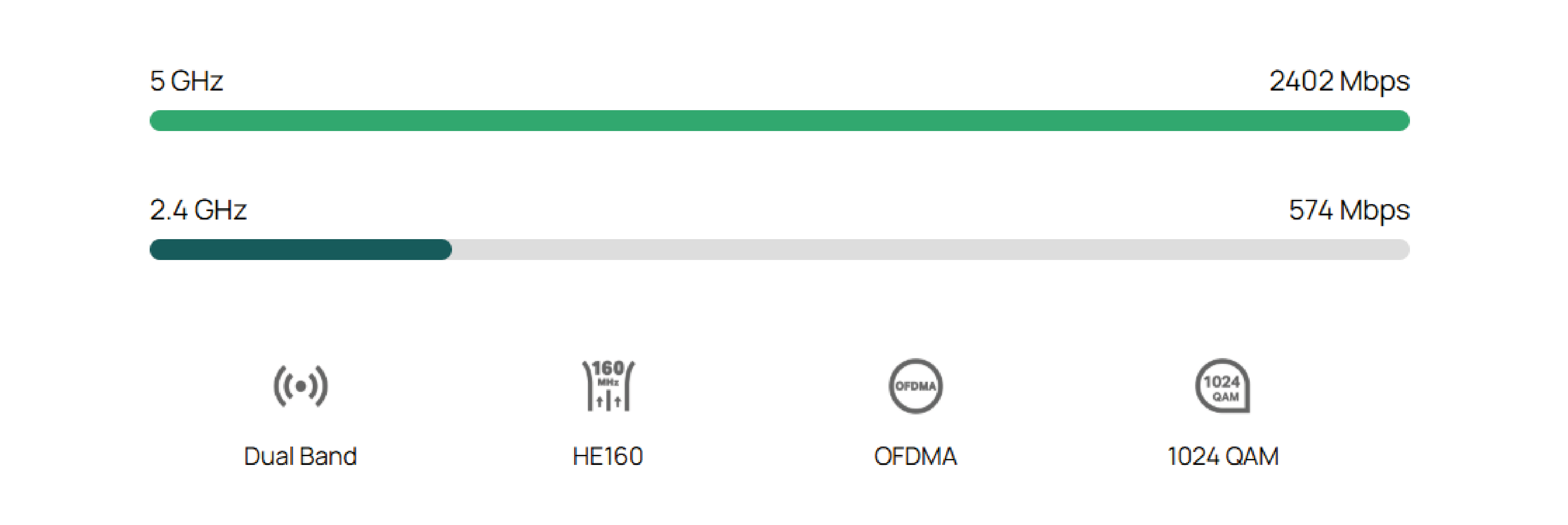 Wi-Fi Frequency & Transfer Rate | 2.4 GHz: 574 Mb/s 5 GHz: 2402 Mb/s (HE160) |