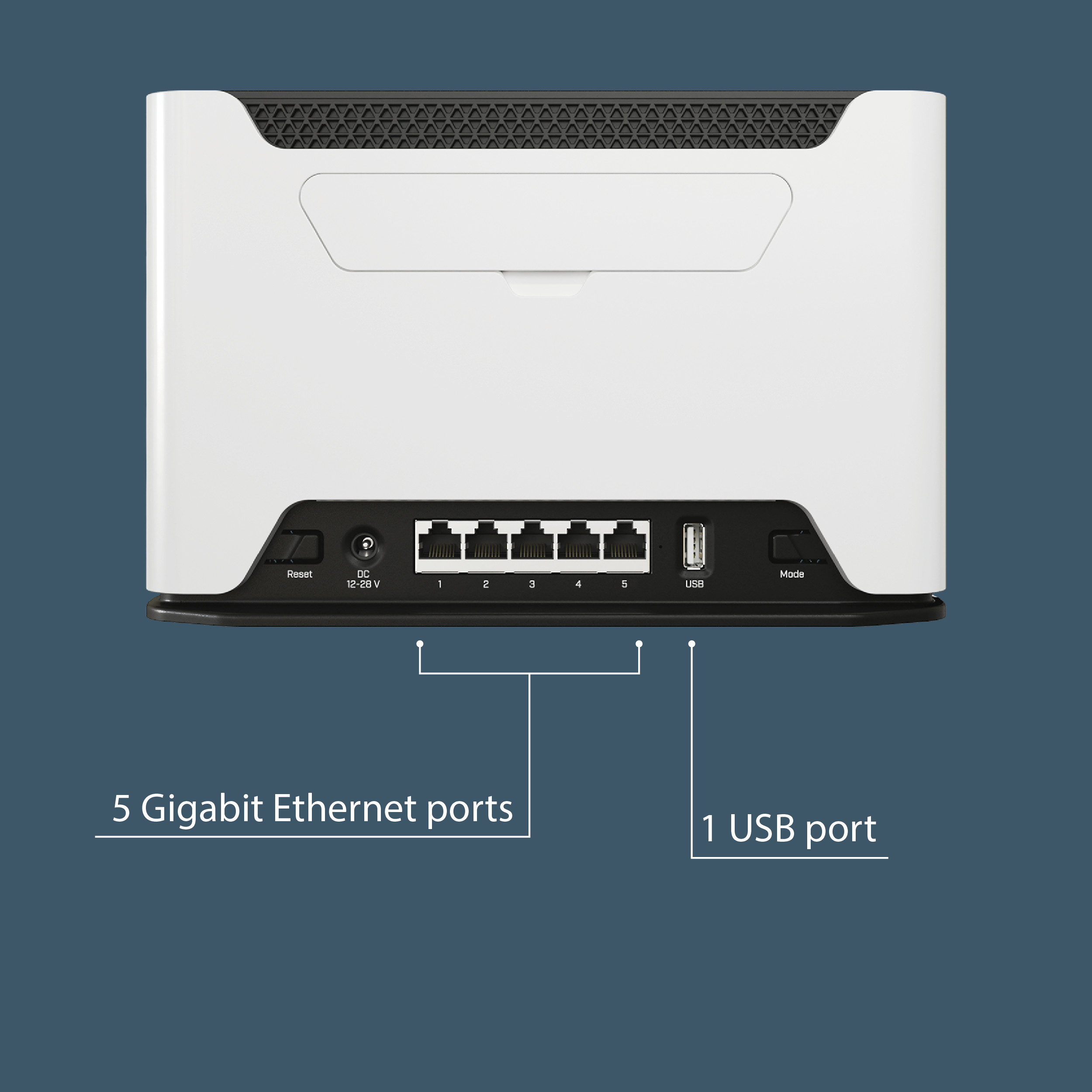 The router is equipped with 5 Gigabit Ethernet ports (10/100/1000 Mb/s). An additional advantage is the USB port, which you can use, for example, to connect external storage. The Ethernet ports can also be used as WAN ports, depending on your needs.