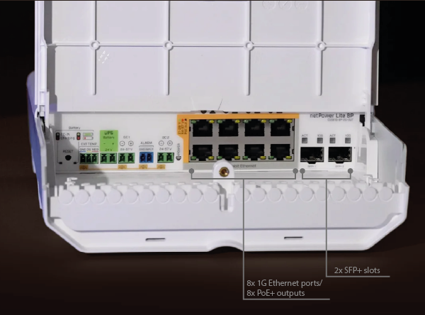 MikroTik netPower Lite 8P is a switch equipped with 8 Gigabit Ethernet ports (10/100/1000 Mbps) and 2 SFP+ slots (10 Gbps). Each Ethernet port provides PoE+ power output (802.3af/at), with a maximum power budget of 30 W per port and 120 W for the entire device (the total budget depends on the power supply used; the power supply must be purchased separately). The switch features an outdoor-ready enclosure with an IP55 protection rating. The set includes a bracket that allows you to mount the device on a pole. The most important advantage of the netPower Lite 8P is its integrated UPS functionality — you can connect external batteries to the switch (24 V DC input voltage). An external temperature sensor can also be connected, and the alarm port enables simple (2-wire) operating-status reporting. The charging current ranges from 0.2 to 1.6 A, and the voltage from 20 to 31.7 V. The product comes with the SwOS system, which provides Layer 2 management capabilities.