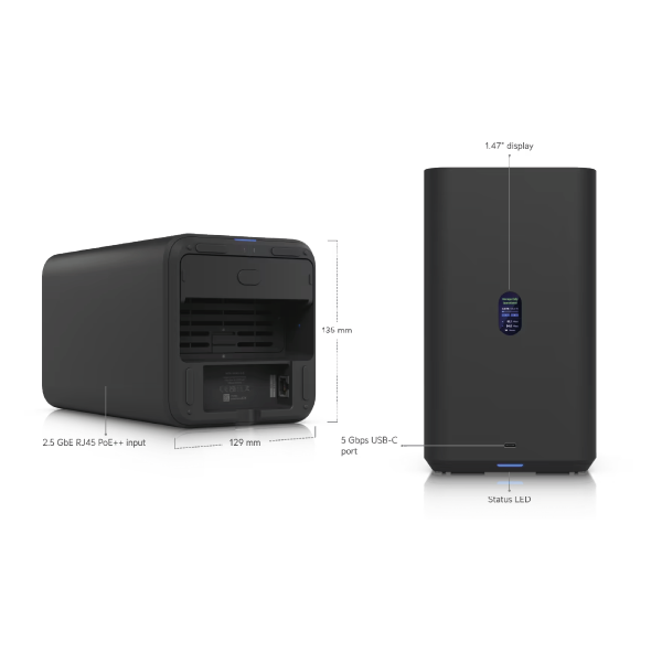 The Ubiquiti UNAS 2 is a NAS server equipped with 2 bays for 3.5" HDD hard drives. It supports RAID 1, file encryption, snapshot creation, and many other useful features. It has 1 × 2.5G Ethernet port, enabling high local network throughput, which translates into faster file downloads/uploads. The device features a desktop-type enclosure and can be powered via PoE++ (802.3bt); the appropriate power adapter is included in the package. The UNAS 2 also has an additional USB Type-C port that supports throughput of up to 5 Gb/s.