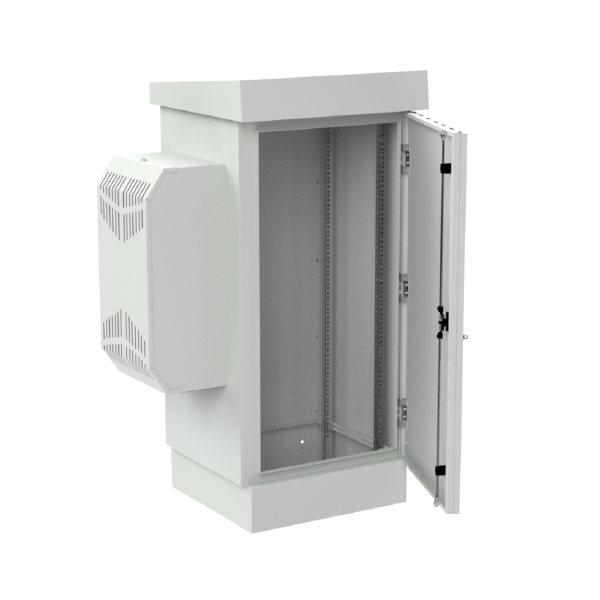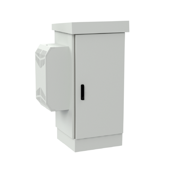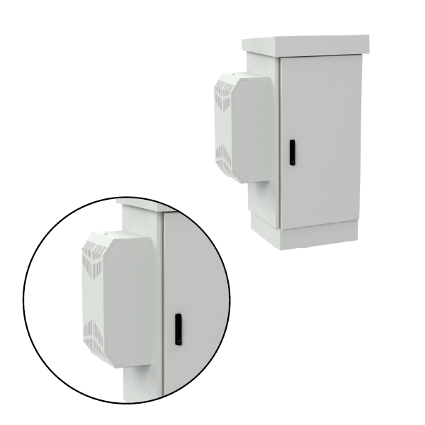 Thanks to the use of an air conditioner, the cabinet does not require ventilation holes in the lower section (unlike standard outdoor freestanding cabinets). This results in a higher protection rating of IP65, compared to IP54 for non-air-conditioned cabinets. The construction is fully protected against water and dust ingress. It is a freestanding cabinet that can be anchored to the ground (e.g., concrete), mounted on a telecommunications manhole, or placed on a pedestal (sold separately).