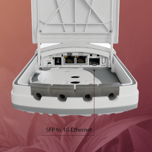 The MikroTik FTC21-ups is a media converter that allows you to convert an SFP (fiber optic) signal to a 1G Ethernet port. It comes with a preinstalled SwOS system, which means it offers more functionality than a standard media converter that you cannot log into. It supports VLANs, SNMP reporting, basic traffic shaping, and ACL lists. The FTC21-ups has two 1G Ethernet ports (10/100/1000 Mb/s). The first port features PoE+ input (802.3af/at), while the second port provides PoE output (passive 24 V or 48 V DC). Power can also be supplied via the DC jack, with an input voltage range of 24–57 V DC. The main advantage of this device is its built-in battery – two Li-Ion NCA 18650 cells with a total capacity of 2.5 Ah. In the event of a power failure, the FTC21-ups switches to battery power to ensure continuous operation. In battery mode, the converter can operate for about 6 hours. When powering other devices, this time is reduced: according to the manufacturer, the operating time is 45–55 minutes for the Cube 60Pro, 1–2 hours for the LHG 5, and about 3.5 hours for the SXT LTE7 kit. When mains power is restored, the FTC21-ups starts charging the batteries. The offered product has a sealed enclosure designed for outdoor use, with an IP67 protection rating. All these features make the FTC21-ups an excellent solution for connecting outdoor devices located far from the main network. It allows you to connect such a device via a fiber optic link while simultaneously providing backup power. For critical network elements, this is a much better solution than, for example, a wireless link.