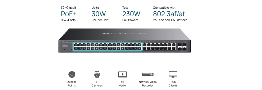 Porty     32 porty RJ45 PoE+ 10/100/1000 Mb/s (Autonegocjacja/Auto MDI/MDIX)