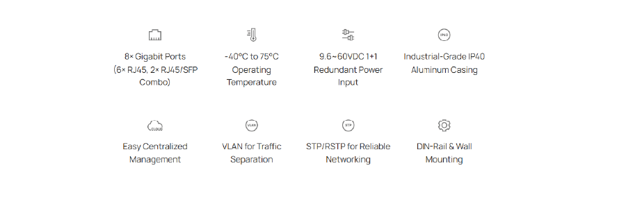 | Ports | 6× 10/100/1000 Mbps RJ45 Ports 2× Gigabit Combo SFP/RJ45 Ports Auto-Negotiation / Auto MDI/MDIX |