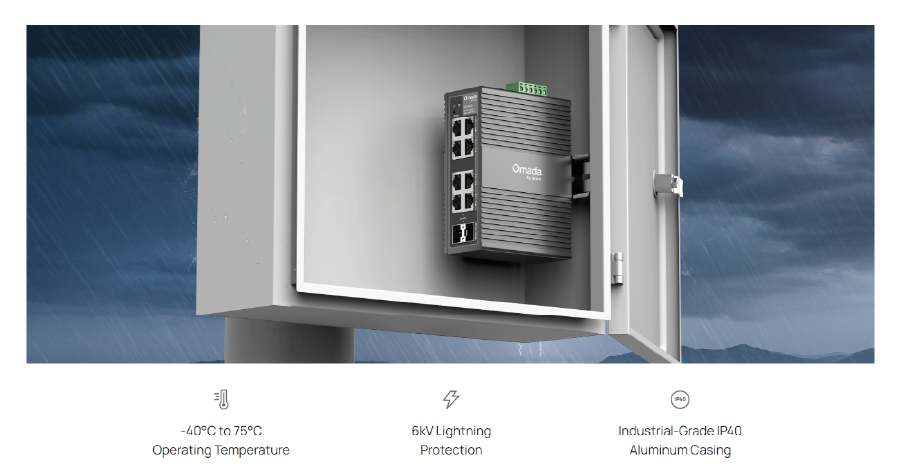 The IES208G industrial managed switch integrates with the Omada SDN system and offers eight Gigabit RJ45 ports providing stable data transmission in local networks. The device features an IP30-rated metal housing suitable for DIN rail mounting and operates passively in a wide temperature range from -40°C to 75°C. The unit ensures high reliability through redundant DC power inputs and supports advanced Layer 2 functions, including VLAN traffic segmentation, QoS prioritization, and STP loop elimination protocols. Management is performed centrally via the Omada platform or through a local GUI interface, making the switch an ideal solution for demanding industrial environments and building automation systems.