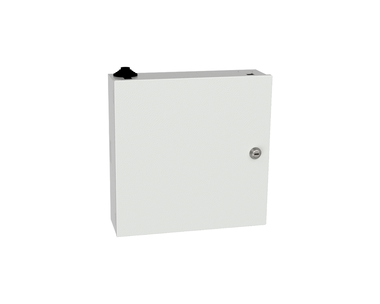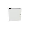 The offered product is an access distribution box designed for wall mounting inside buildings. It is made of steel sheet coated with a Magnelis layer and painted in light gray RAL7035. The manufacturer used a solid door secured with a standard cam lock. The protection rating is IP41, and the mechanical resistance is IK10.
