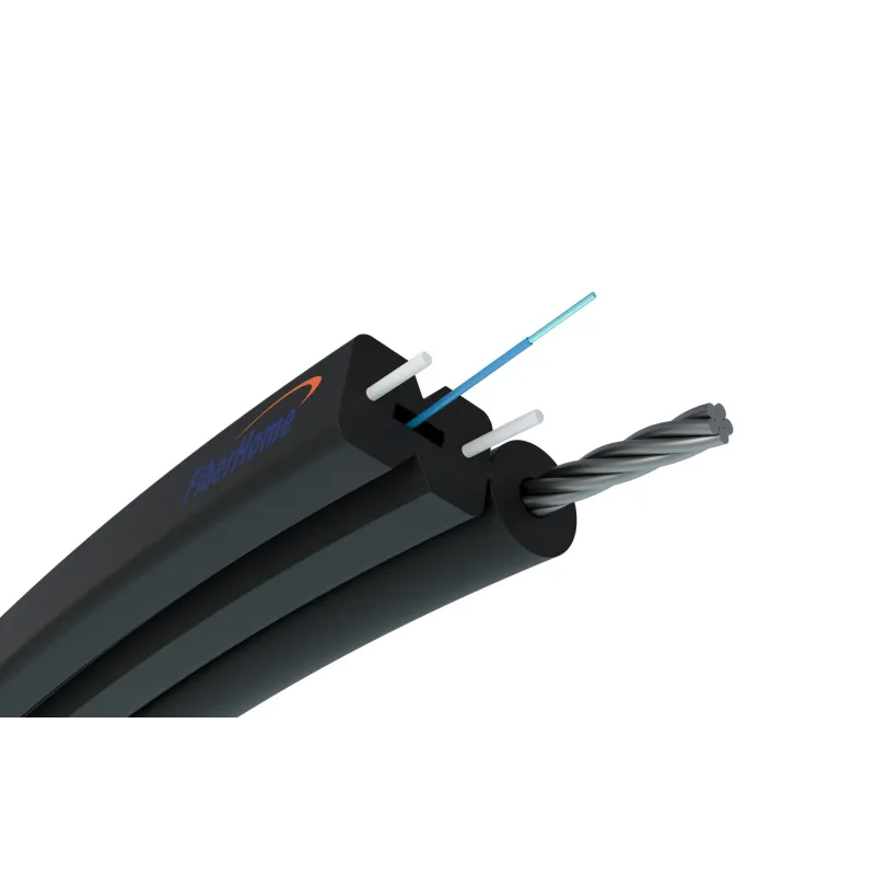 The offered product is a flat cable with a figure-eight construction. One section contains the main reinforcing element—a steel strand—while the other houses the optical fiber and additional reinforcing elements in the form of FRP rods. Thanks to this design, the cable offers good tensile strength while maintaining compact size and low weight.