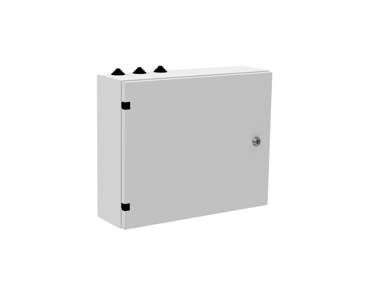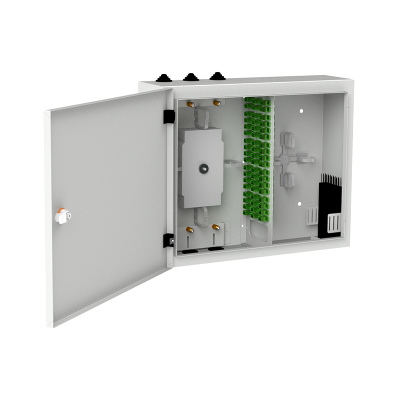 The offered product is a distribution box designed for wall-mounted installation inside buildings. Due to its size and capacity, it can be used in places where many fiber optic lines converge, for example in multi-family buildings for connecting subscribers. The distribution box is made of steel sheet coated with a Magnelis layer and painted in light gray color RAL7035. The manufacturer has used solid, single-leaf doors secured with a standard key lock. The protection rating is IP41, and the mechanical resistance is IK10.