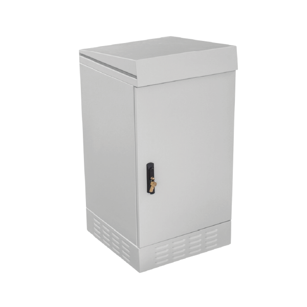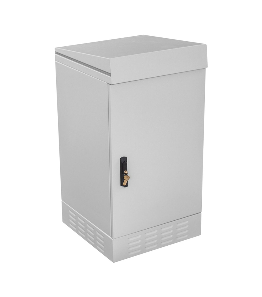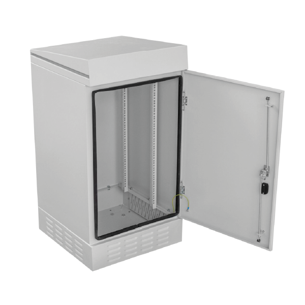 The cabinet features an IP54 protection rating and is designed for outdoor use. The construction is protected against the ingress of water and dust. It is a freestanding cabinet that can be appropriately anchored to the ground (e.g., concrete), mounted on a telecommunications manhole, or placed on a pedestal (sold separately).