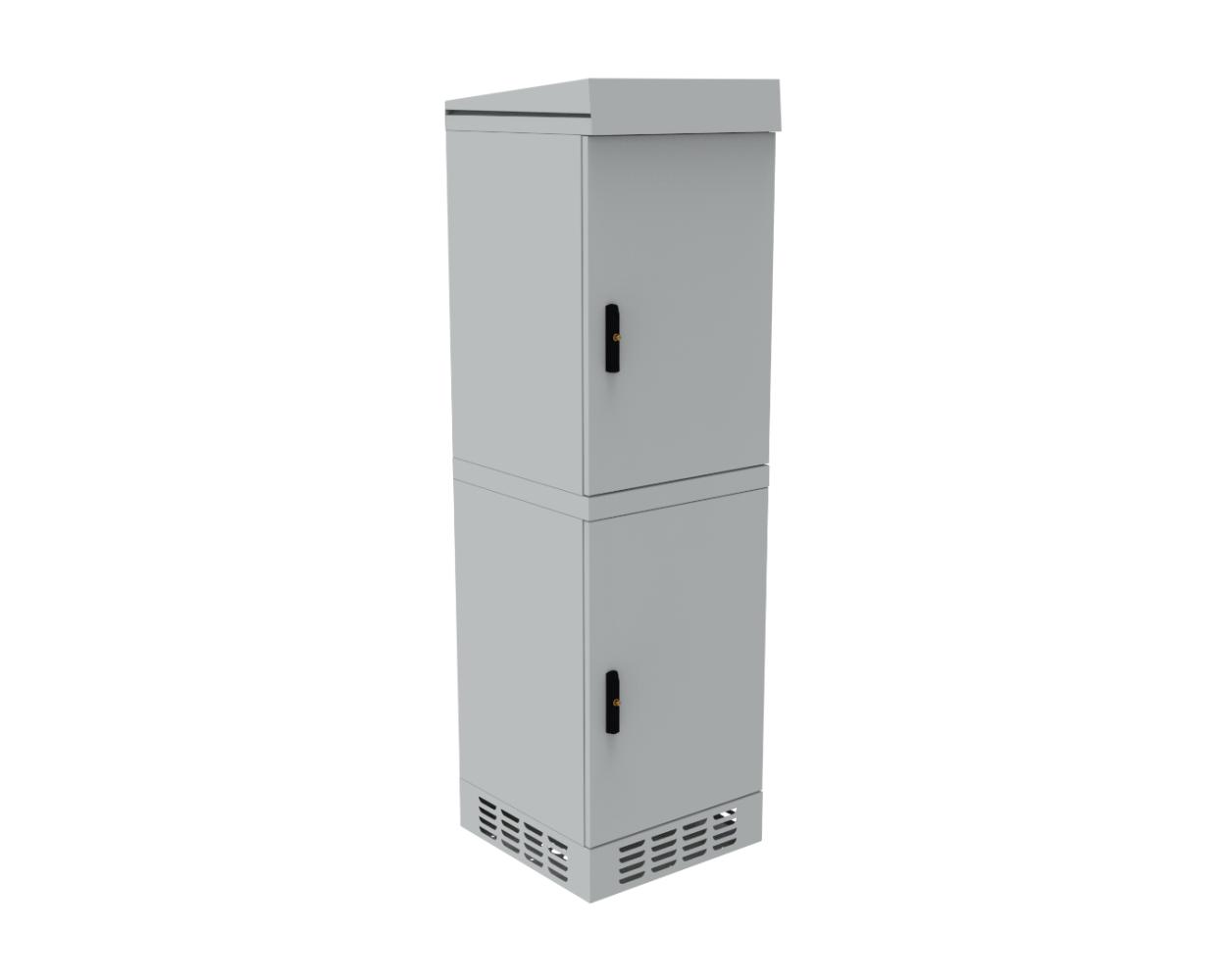 The cabinet features an IP54 protection rating and is suitable for outdoor use. The design is protected against water and dust ingress. As a freestanding cabinet, it can be appropriately anchored to the ground (e.g., concrete), mounted on a telecommunications manhole, or placed on a pedestal (sold separately).