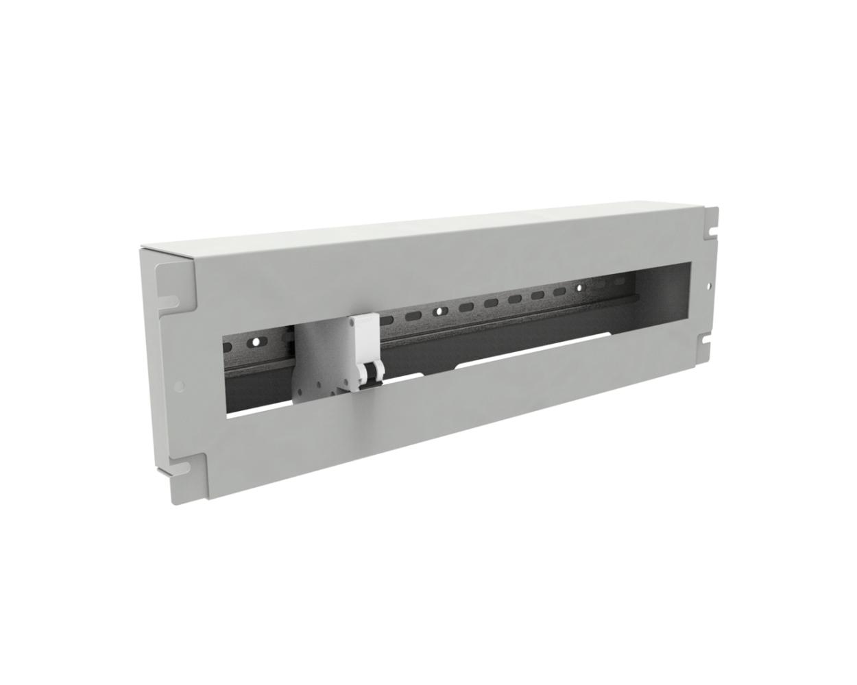 Oferowany produkt to panel o wysokości 3U przeznaczony do stosowania w szafach Rack 19". Wewnątrz posiada szynę DIN (TH35) o pojemności do 22 modułów. Od frontu znajduje się demontowalna osłona, która zabezpiecza użytkowników przed przypadkowym dotknięciem modułów zamontowanych w panelu. Oba elementy są połączone przewodem uziemiającym. Całość została wykonana z blachy stalowej pokrytej powłoką Magnelis.