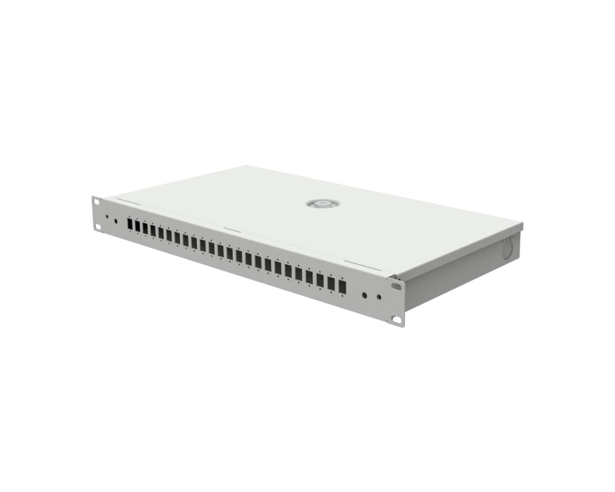 Commutatore ottico Opton dedicato al montaggio negli armadi Rack 19". L'altezza e` di 1U, il prodotto e` stato fatto della lamiera d'acciaio dello spessore di 1 mm coperto dal rivestimento Magnelis. Nella parte posteriore e nelle parti laterali si trovano i fori vuoti. All'interno ci sono i posti dove si puo' mettere il cavo con le fascette.  La vite nella parte centrale serve al montaggio del vassoio di saldature. Il panello anteriore permette di montare 12 adattatori tipo SC Duplex o LC Quad.