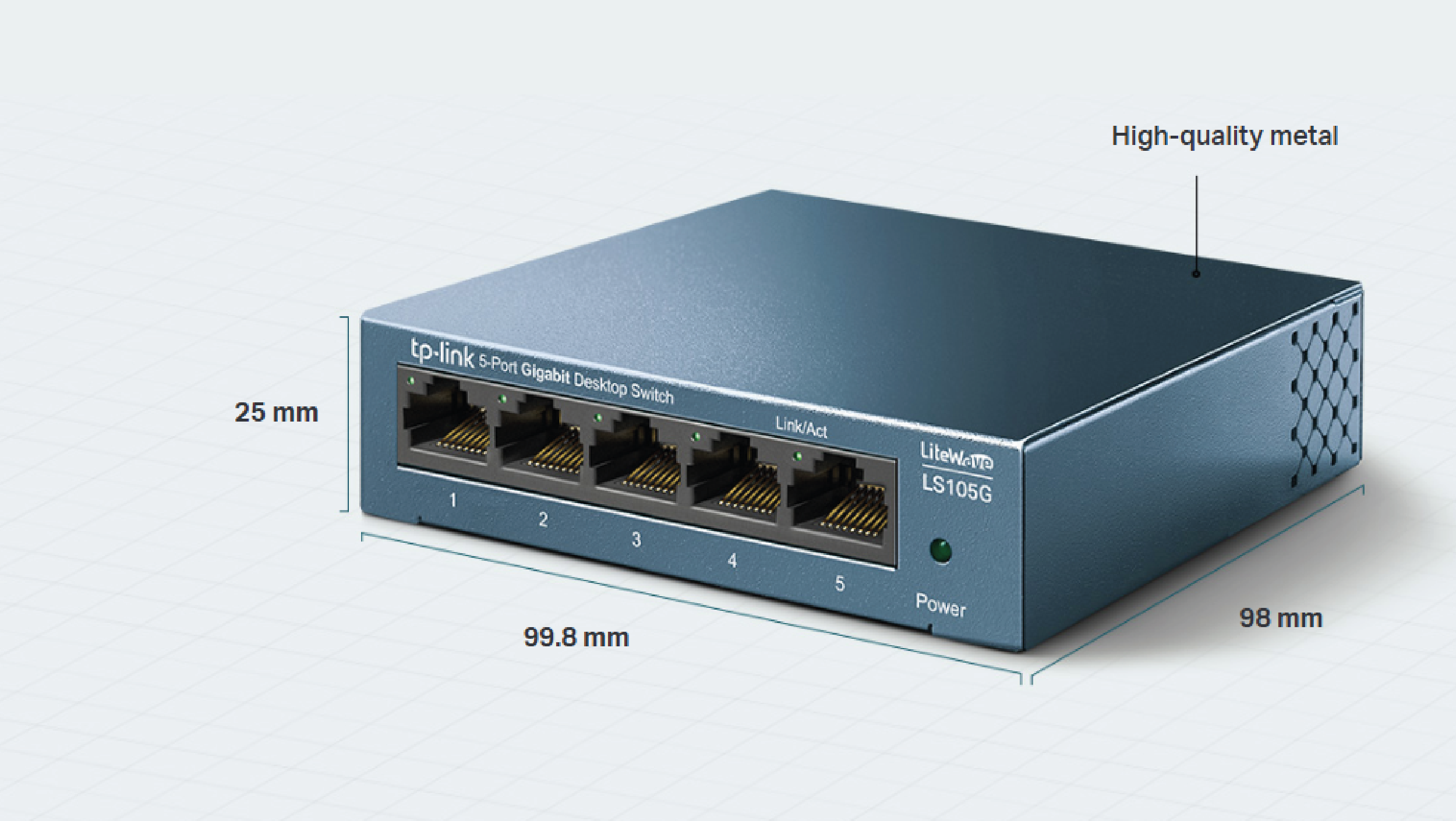 The components of the LS105G are enclosed in a high-quality metal casing, ensuring product durability. Subjected to rigorous reliability tests, the LS105G switch guarantees high switching performance. Its compact size allows the device to be mounted on all countertops and desks.