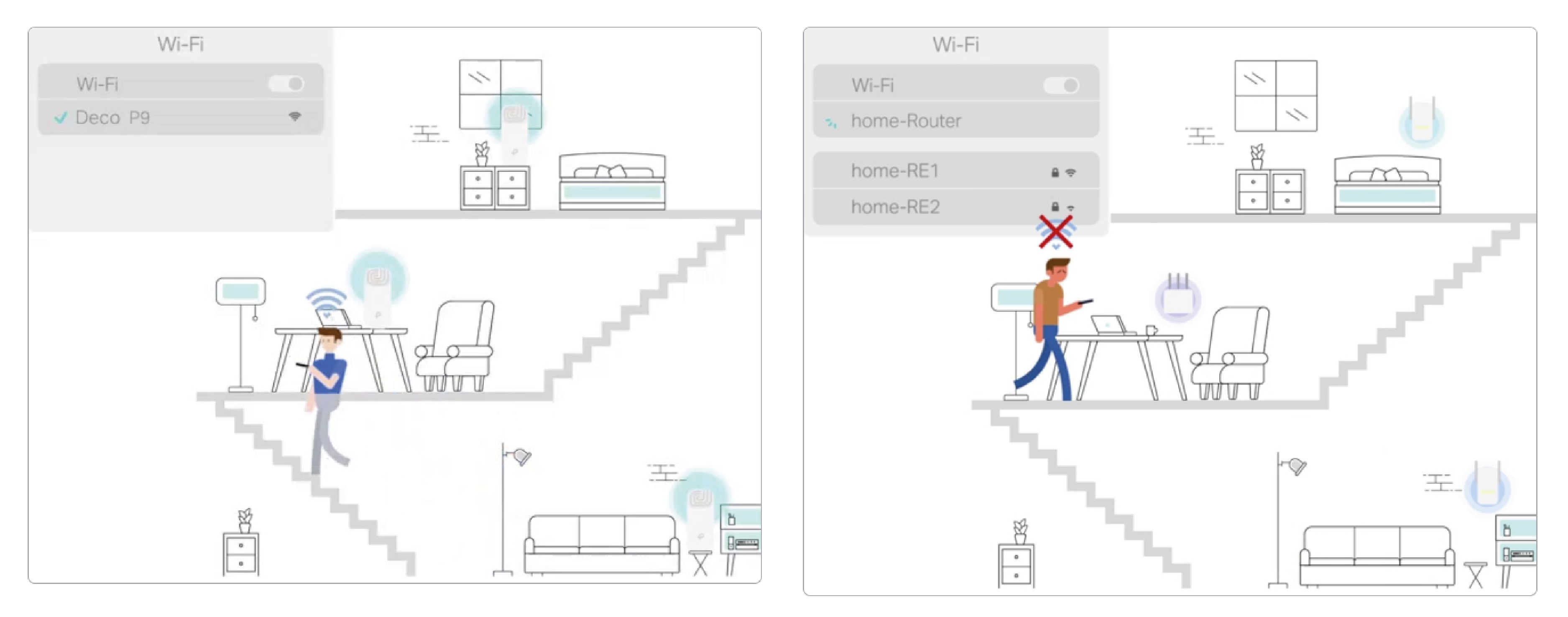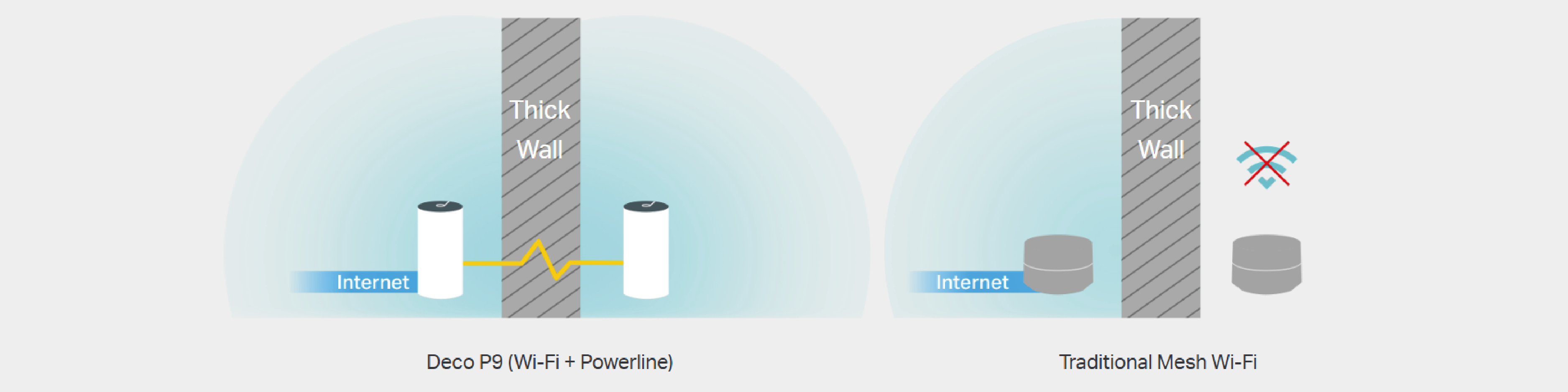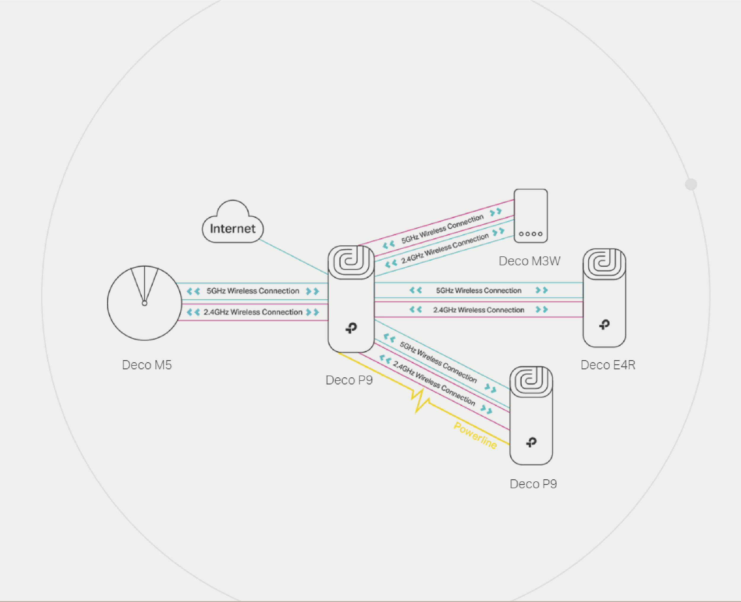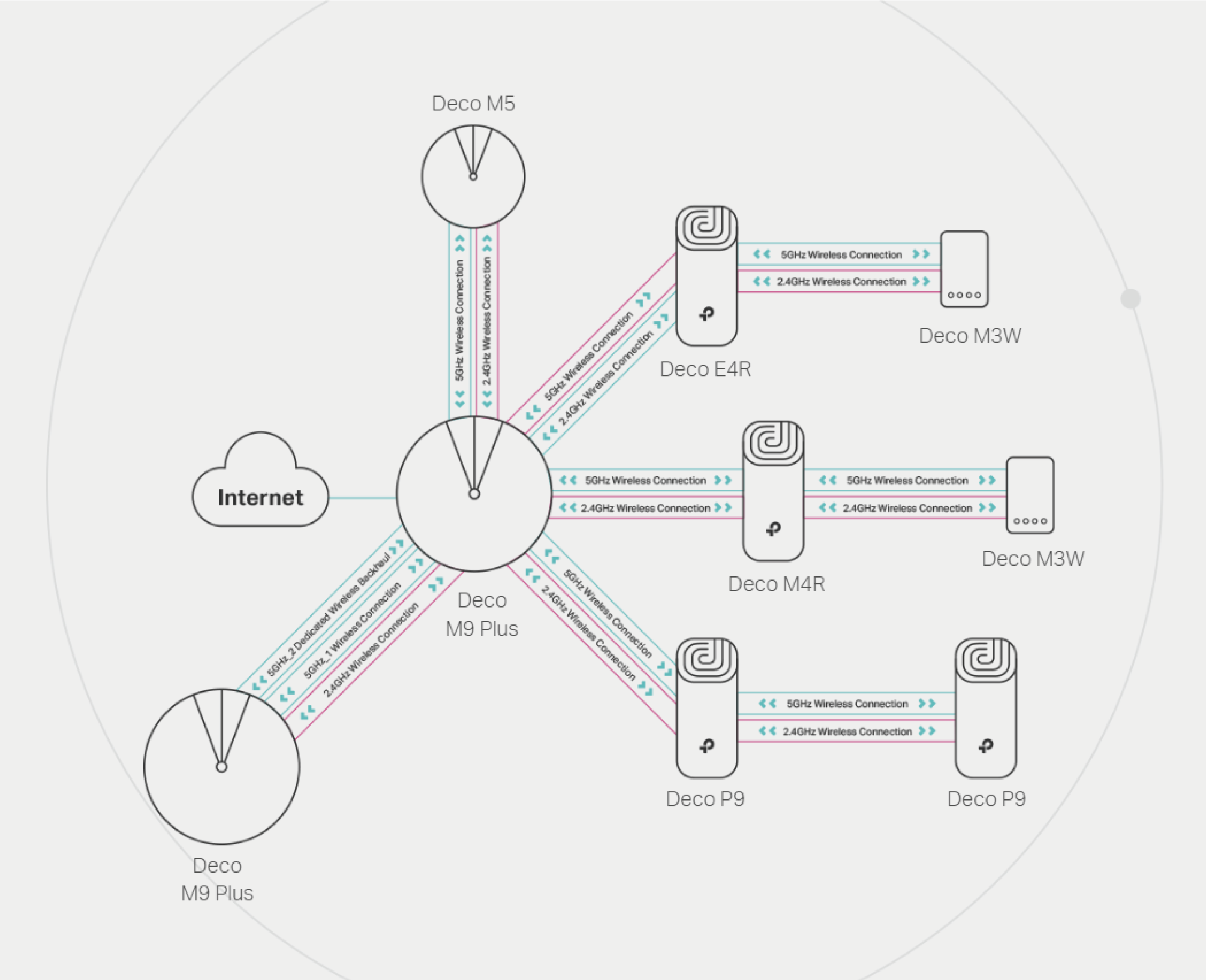 The Deco P9 can create a Mesh network with any other Deco model. To increase network range, simply add more Deco devices to it.