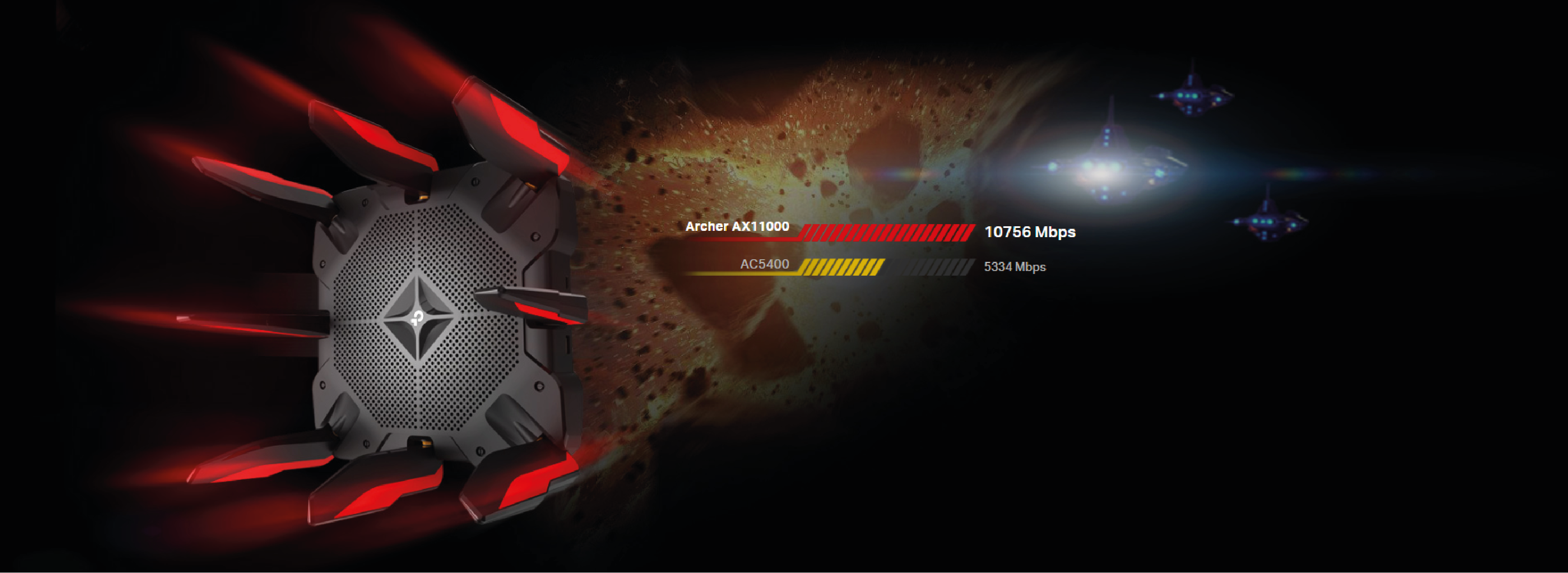 The TP-Link Archer AX11000 is a tri-band wireless router of the AX11000 class operating on the Wi-Fi 6 (IEEE 802.11 ax) standard. The device offers a maximum theoretical cumulative throughput of 10756\ Mb/s (1148 Mb/s in 2.4 GHz and two 5 GHz bands at 4804 Mb/s each). It uses 4x4 MU-MIMO technology for efficient simultaneous handling of multiple devices and Beamforming for range optimization via eight external antennas. Wired connectivity is provided by a 2.5G Ethernet WAN port and eight Gigabit Ethernet LAN ports. The heart of the device is a 1.8 GHz quad-core processor supported by 1 GB of RAM. The router includes special features for gamers, including Game Accelerator and Game Protector.